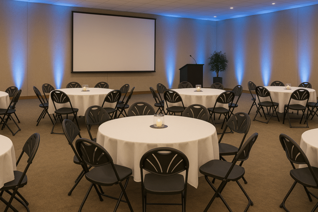 Event EVENT RENTALS Tables & Chairs Linens Audio & Visual Dance Floor Food & Beverage Dinner & Glassware (Glassware will have some water spots. Polishing may be required prior to use) Lighting Party Equipment Staging Tents Wedding Specific Bounce Houses, Slides, and Helium